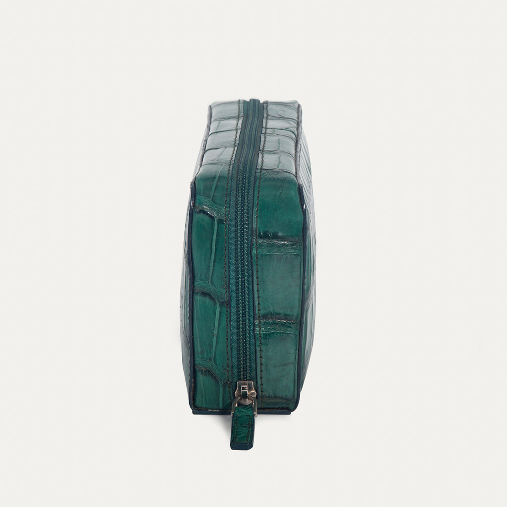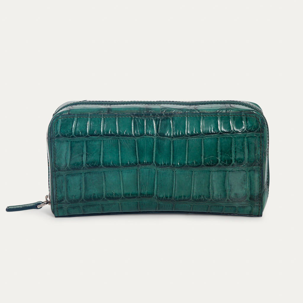 An elegant crocodile toiletry kit that is suited for the immaculate traveler. Carefully hand crafted, this is the ideal size to hold your grooming essentials. It is fully lined with a light weight calf, and boasts a slim interior pocket and side gussets that allow for easy organization and access.