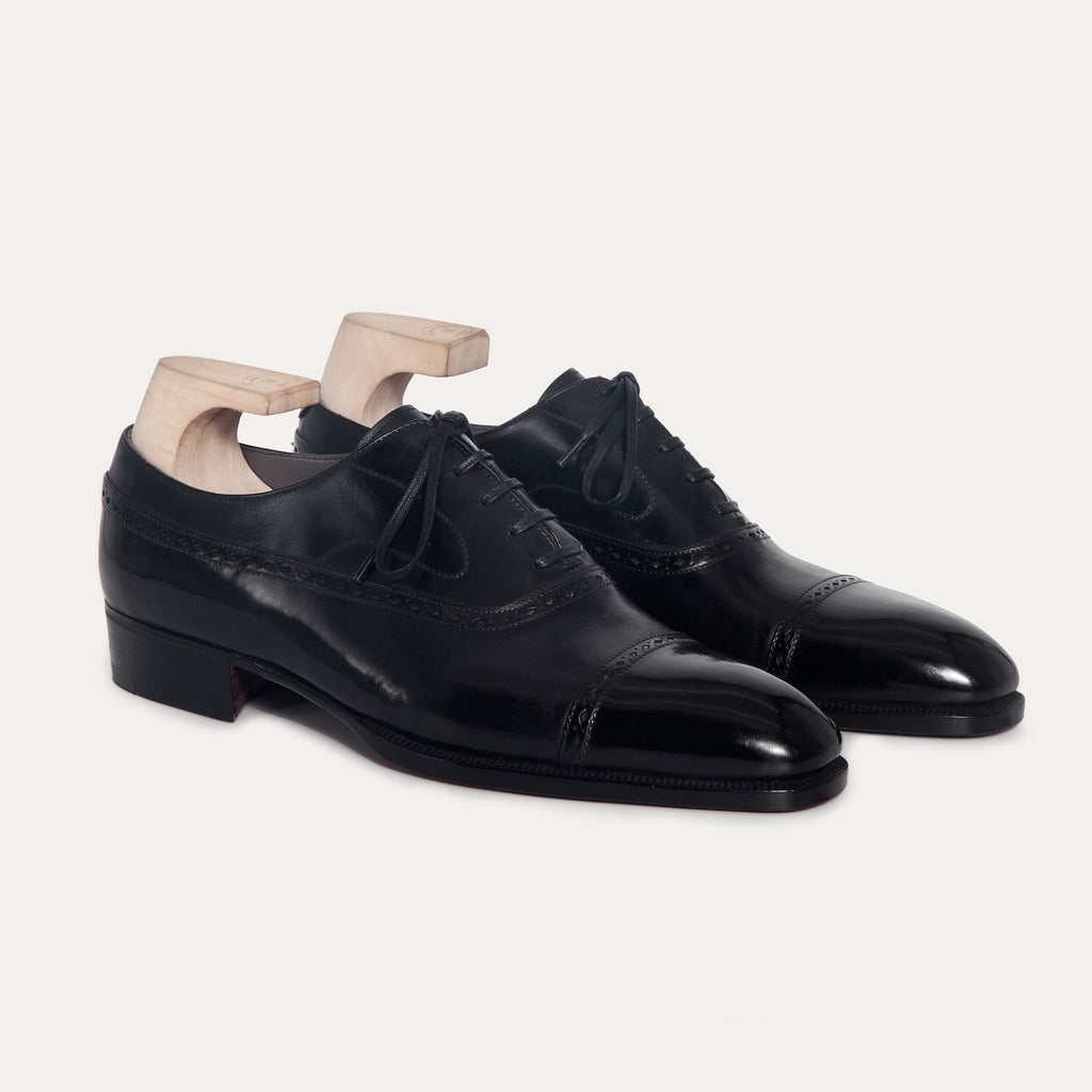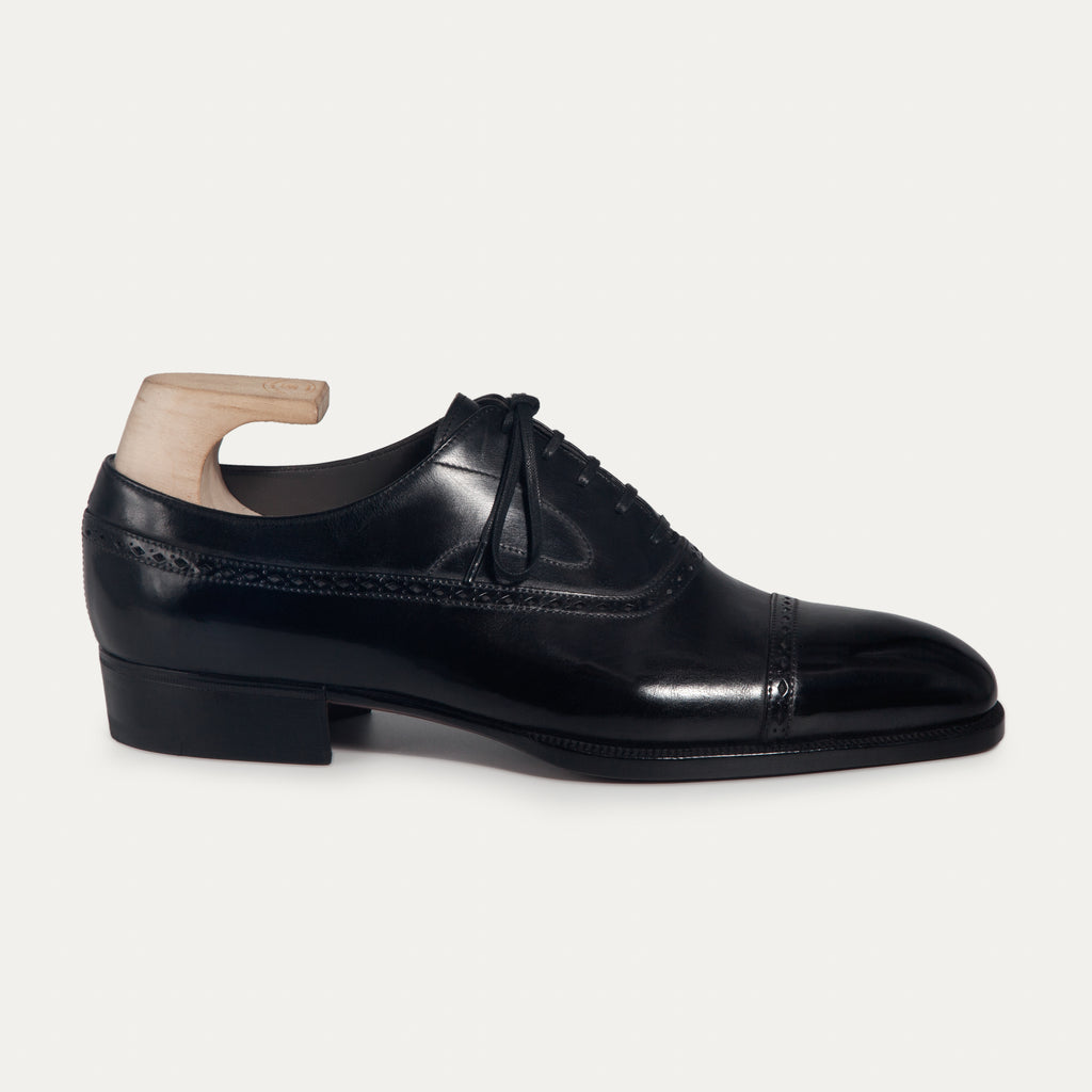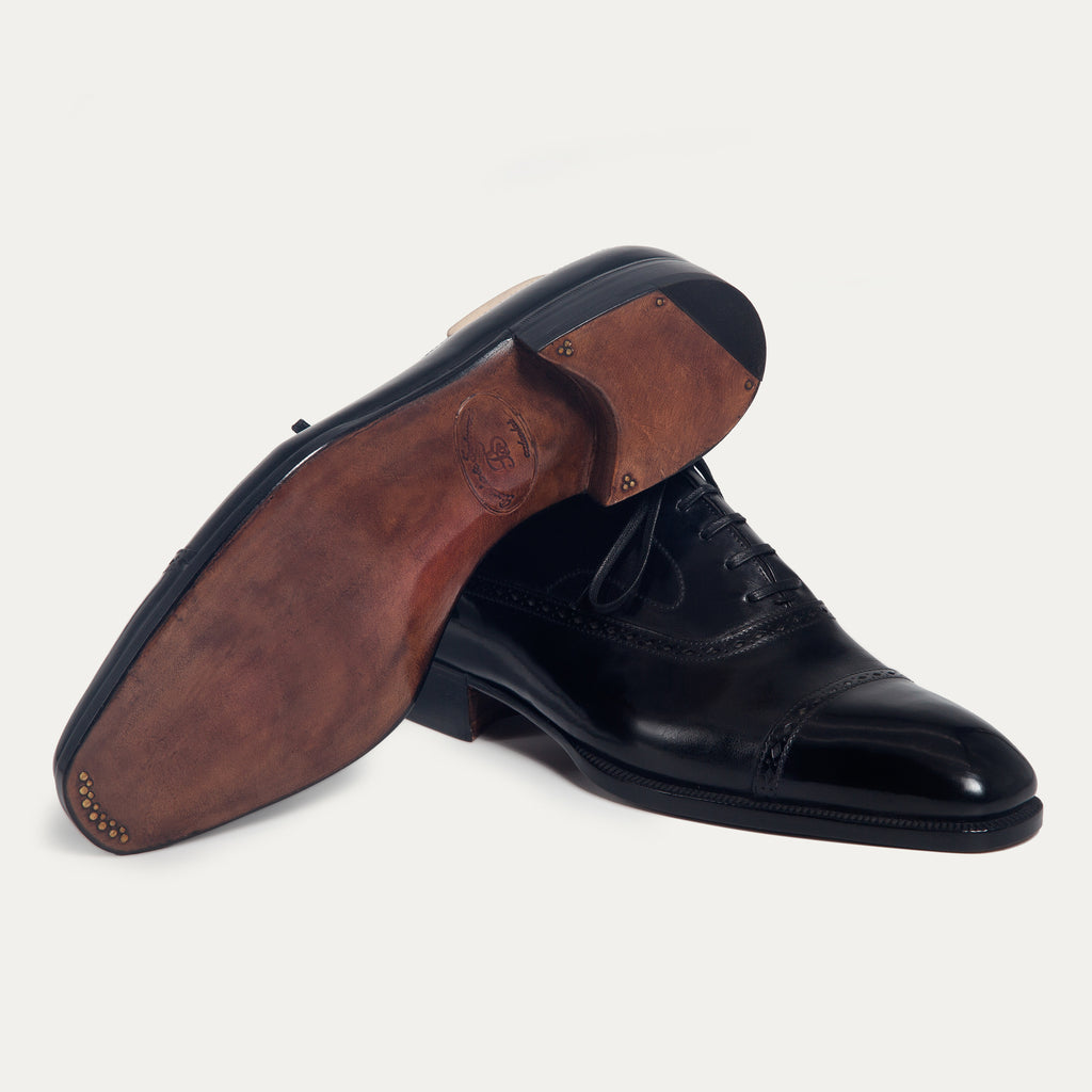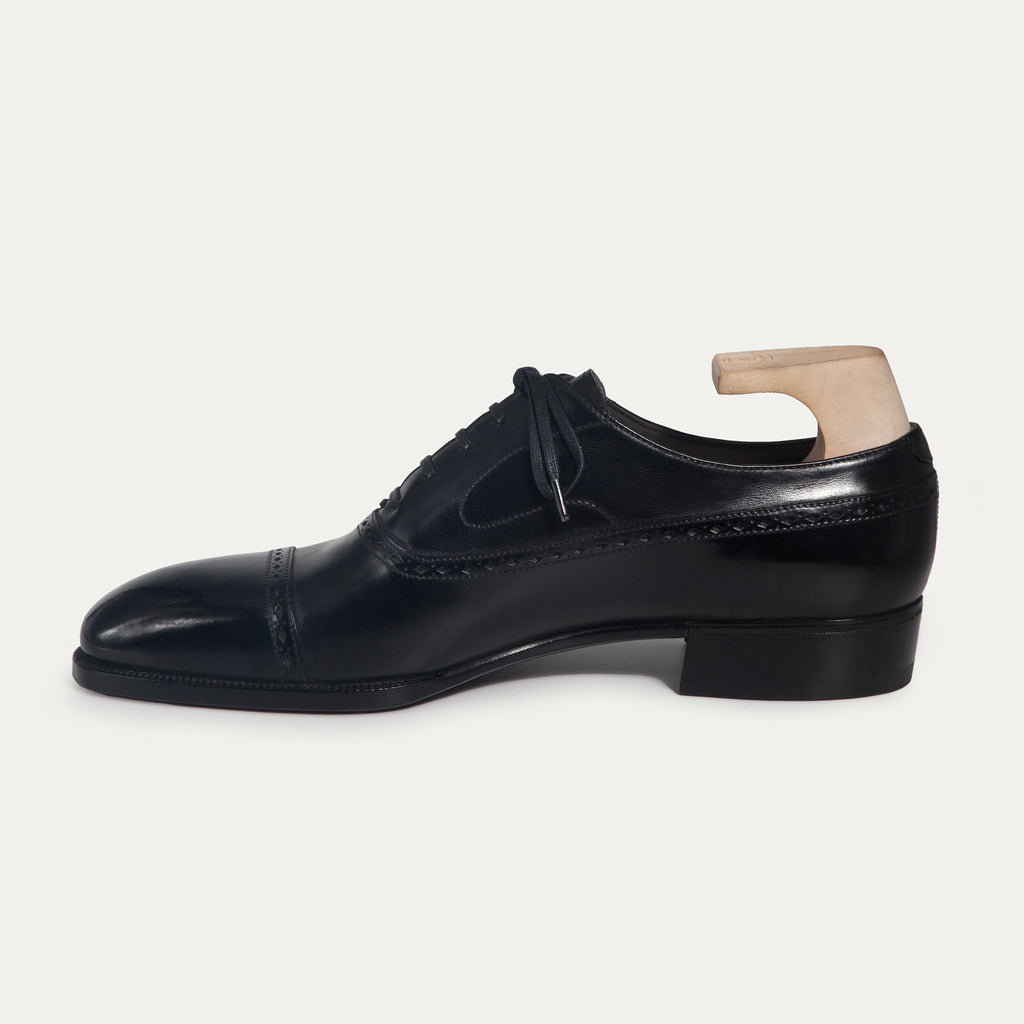 A masterpiece of handwork, this cap toe oxford has a softly squared toe and is subtly embellished with hand stamped broguing. Featuring the finest box calf leather upper, a butter soft calf leather lining and a hand-burnished patinated sole, the Firenze will complement and elevate the most elegant business suiting.