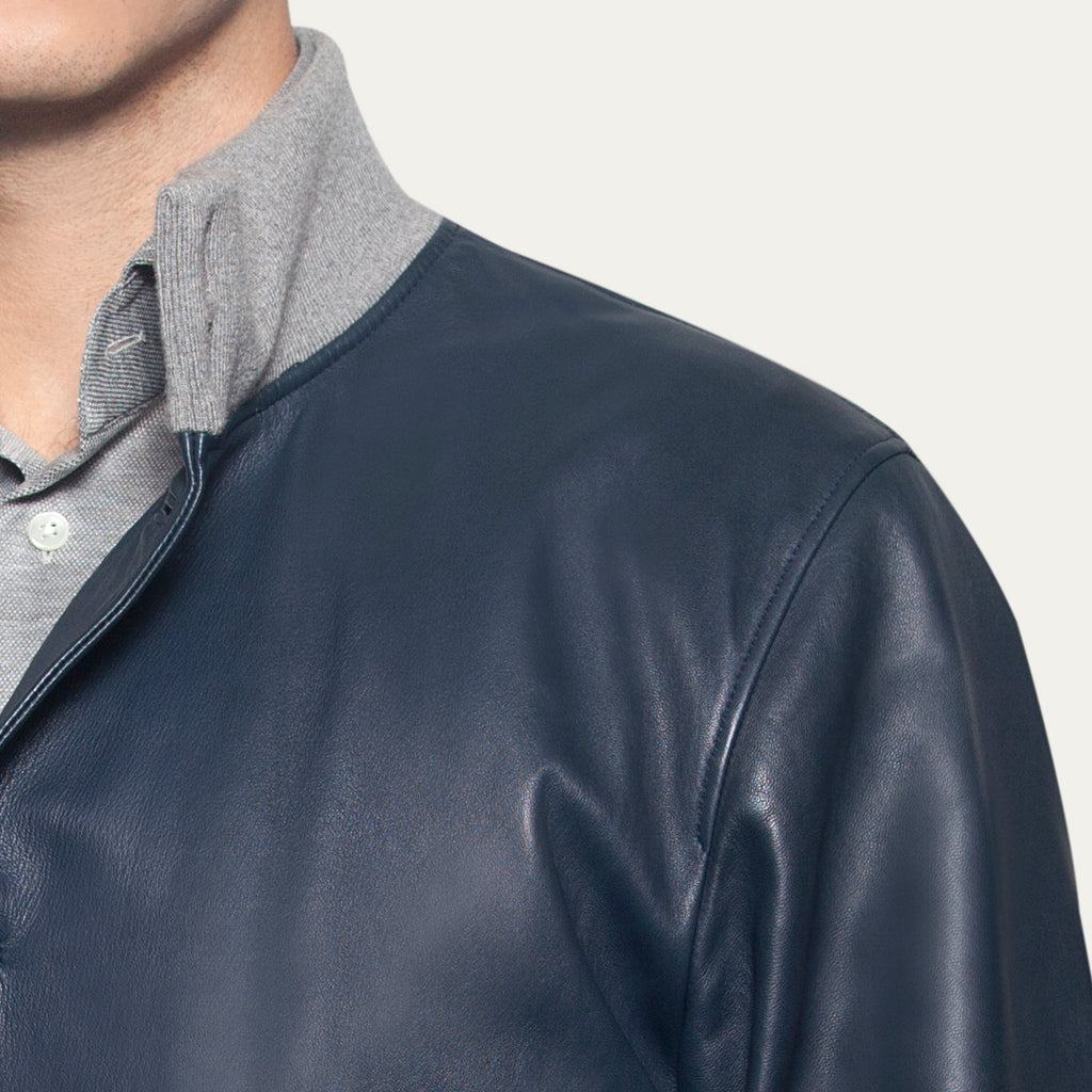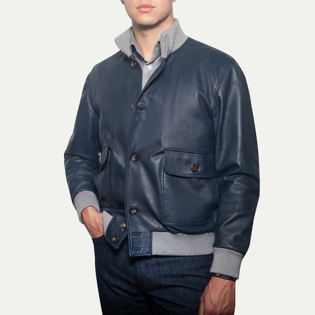 Bocache and Salvucci's interpretation of a refined pilot jacket is made from supple Napa calf leather and detailed with Italian wool and stretch trims. It has been finely hand finished with tonal overstitching, button holes, and is fully lined with silk sourced from Como. It is an ideal jacket for the spring and early fall paired with jeans or cotton trousers.