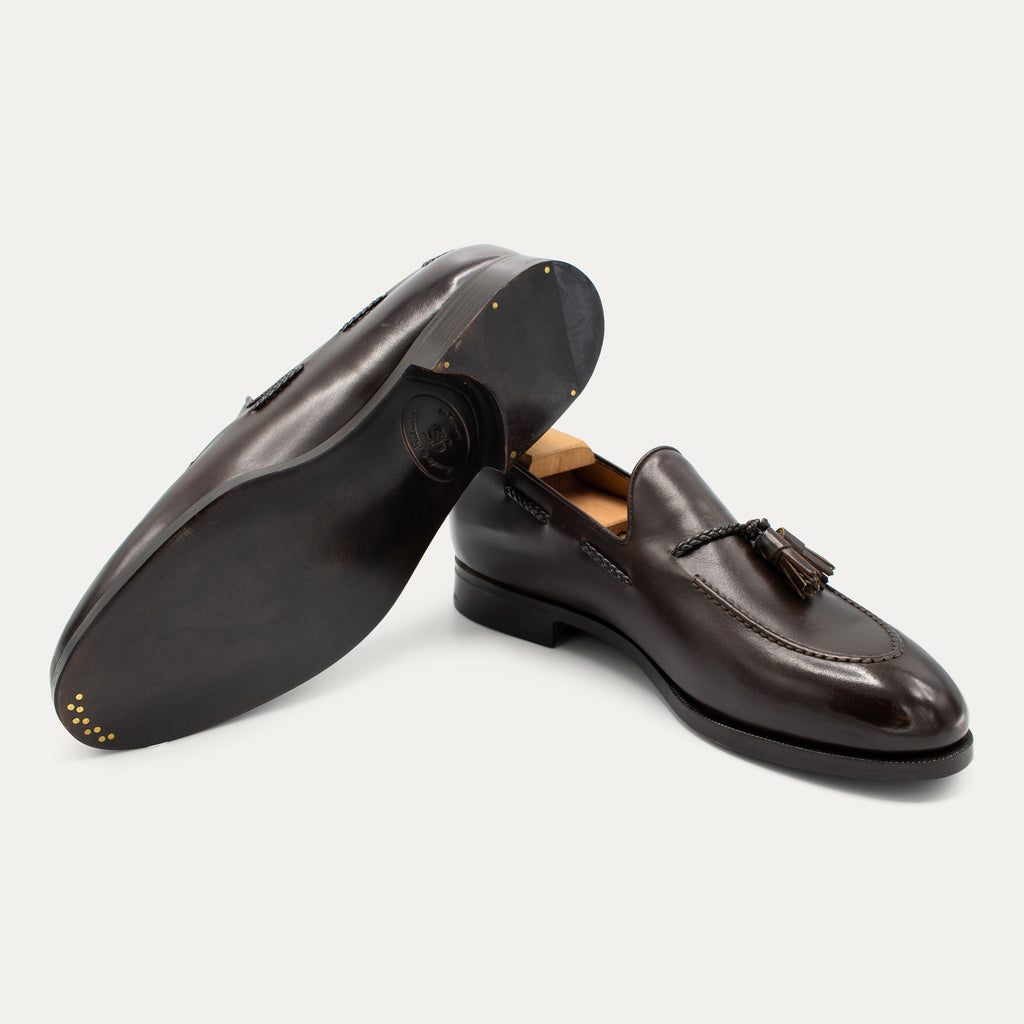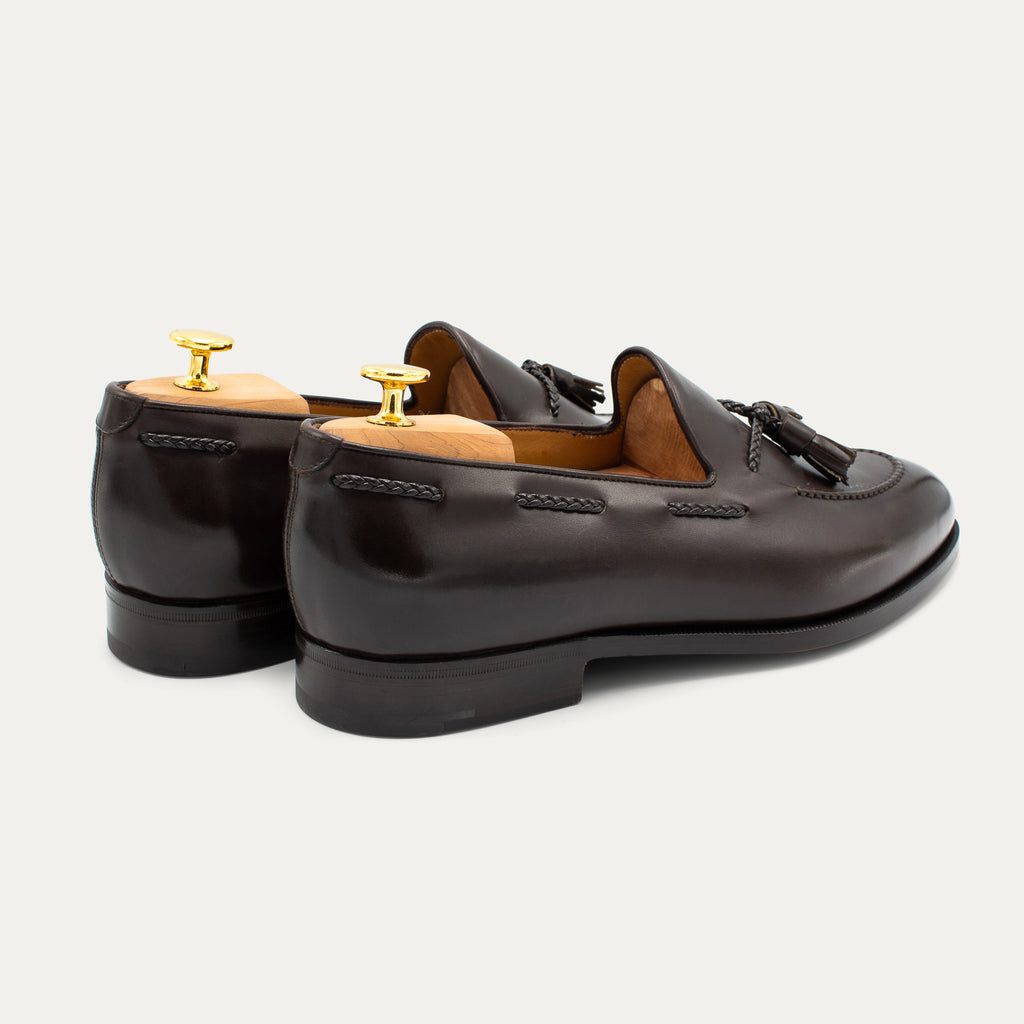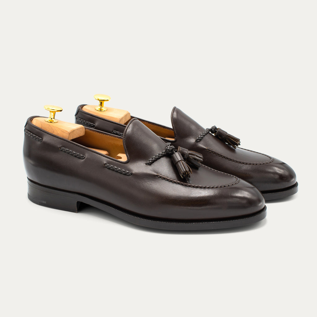 Our iconic Nassau tassel loafer is crafted on a long, narrowed almond toe last. Cut from a single piece of box calf leather, these lined loafers boast a single seam for maximum comfort and elegance. These can be worn with a suit, or a more casual look like jeans and a blazer.