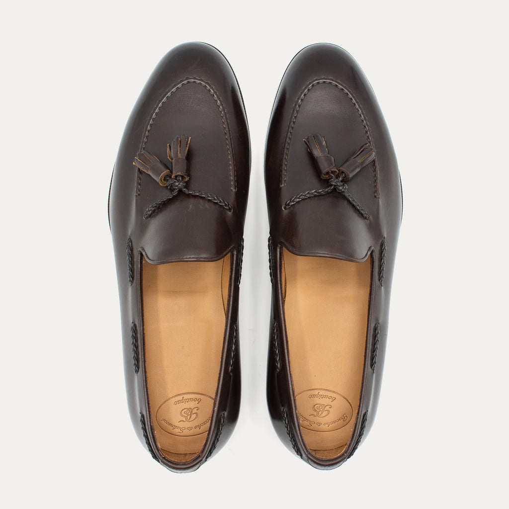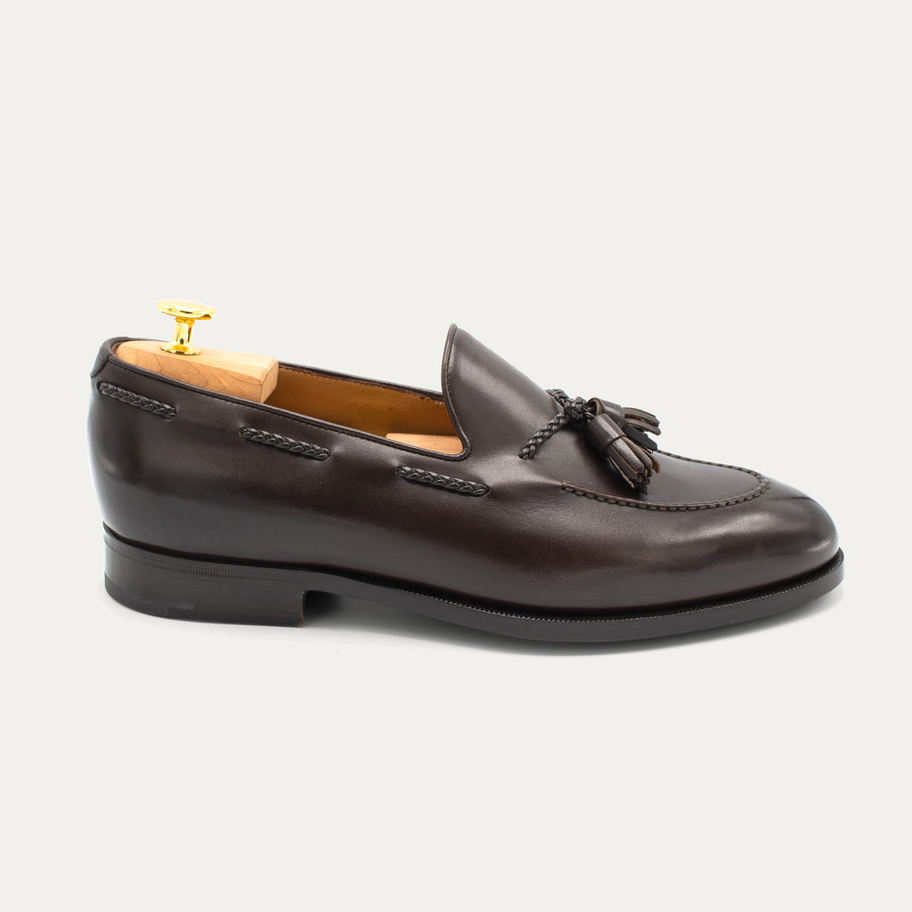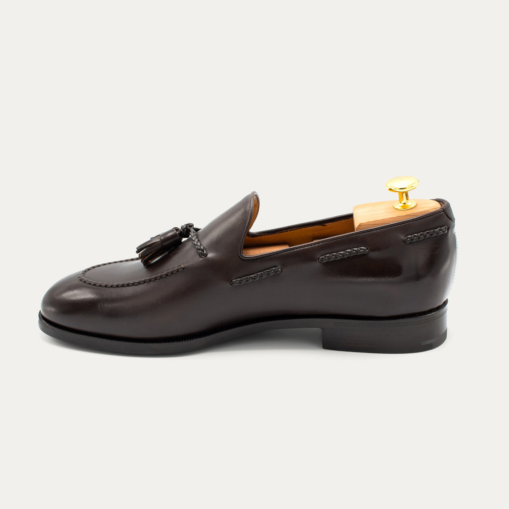 Our iconic Nassau tassel loafer is crafted on a long, narrowed almond toe last. Cut from a single piece of box calf leather, these lined loafers boast a single seam for maximum comfort and elegance. These can be worn with a suit, or a more casual look like jeans and a blazer.