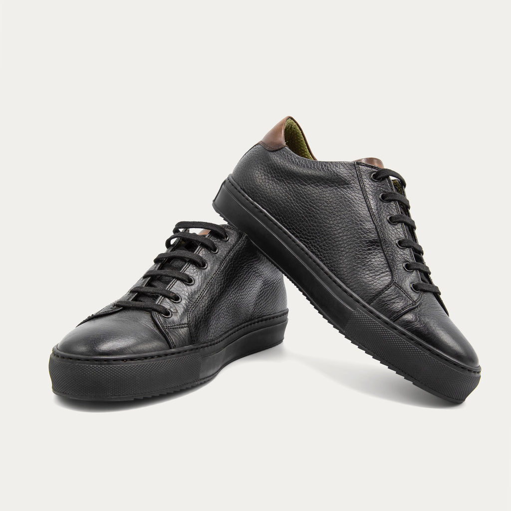 A classic 1970s tennis-style sneaker elevated through exquisite craftsmanship and desirable materials. The Osaka's clean lines and tailored silhouette feature fine calf leather uppers and a hand patinated tongue and heel that are mounted on a springy Margom rubber sole. Pairs perfectly with a textured navy blazer, t-shirt, and trousers.